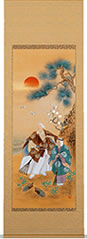 「水墨山水」をはじめ、日本の四季折々の自然の美しさを描いた花鳥風月や、祝慶、 縁起画、書、仏事用に至るまで、価格帯も幅広く、ご用意しております。 「彩色山水」「旭日」「紅白梅」「立雛」「しだれ桜」「兜」「牡丹」「鯉の滝登り」「菖蒲」 「青楓に翡翠」「朝顔」「六瓢箪」「菊」「紅葉」「南天」「竹に雀」「高砂」「松竹梅双鶴」 「四季花」「赤富士」「七福神」「一期一会」など、ほんの一例です。